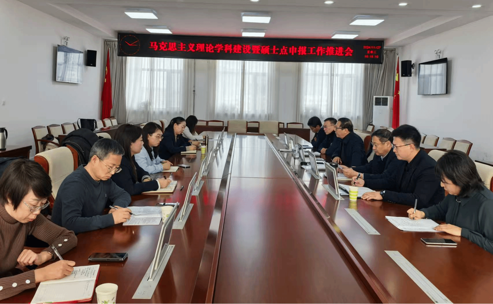 马克思主义学院院长毛锐围绕马克思主义一级学科需求分析和特色优势、二级学科简况、师资队伍、基本条件对标四个方面就马克思主义理论一级学科点申报准备情况进行了详细汇报,各学科方向负责人和骨干教师对标申硕基本条件进行充分交流并提出了建议和发展设想。研究生院院长刘福满、副院长刘国成、科研处处长苑恒轶就马克思主义理论一级学科点对标基本条件存在的短板提出了建设性意见。副校长刘克平结合毛锐院长汇报的学科点准备情况强调,要根据二级学科研究方向做好顶层设计,强力推动硕士点申报工作,学习申评硕士点成功的高校建设经验积极准备,精心打磨学科特色,做到工作前探。
